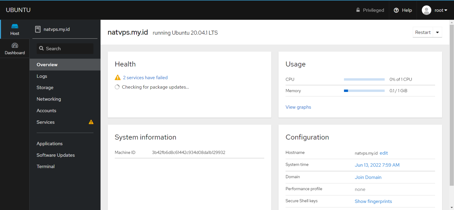 Tutorial ini akan menggunakan OS Ubuntu 20.04. Hampir semua distribusi Linux didukung. Silahkan cek panduan resmi Cockpit untuk informasi lebih lanjut. Tutorial ini juga dapat diaplikasikan di VPS normal (dedicated IPv4), dan akan lebih mudah karena tidak perlu mengatur port forwarding.