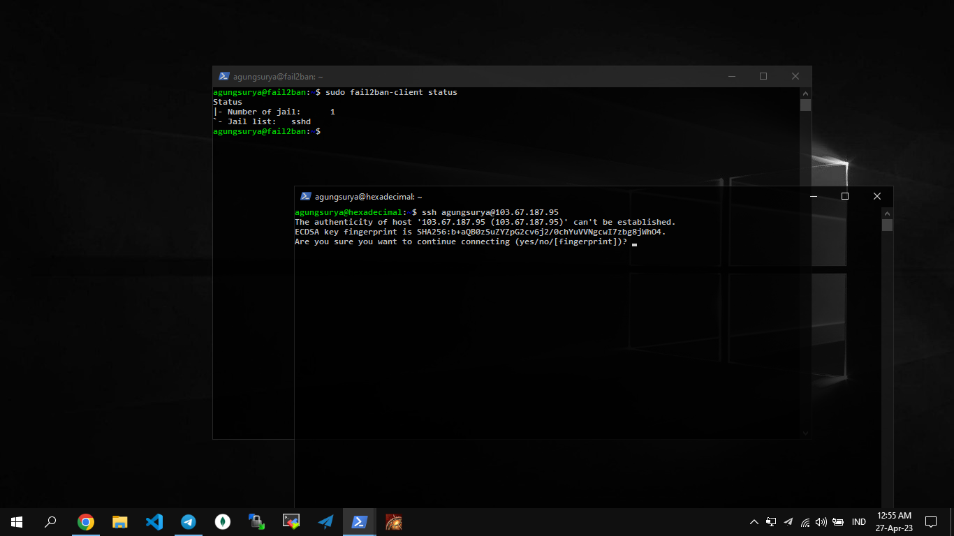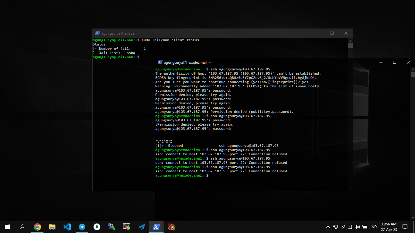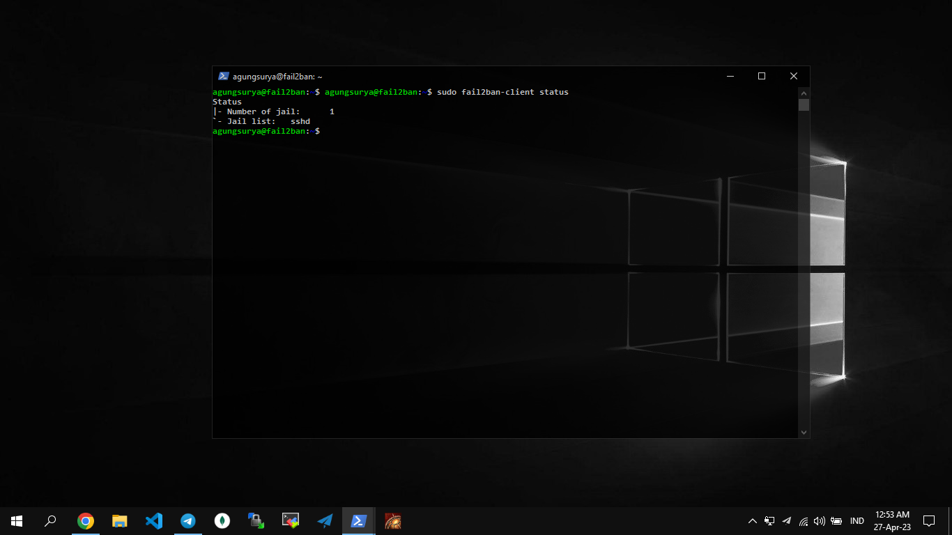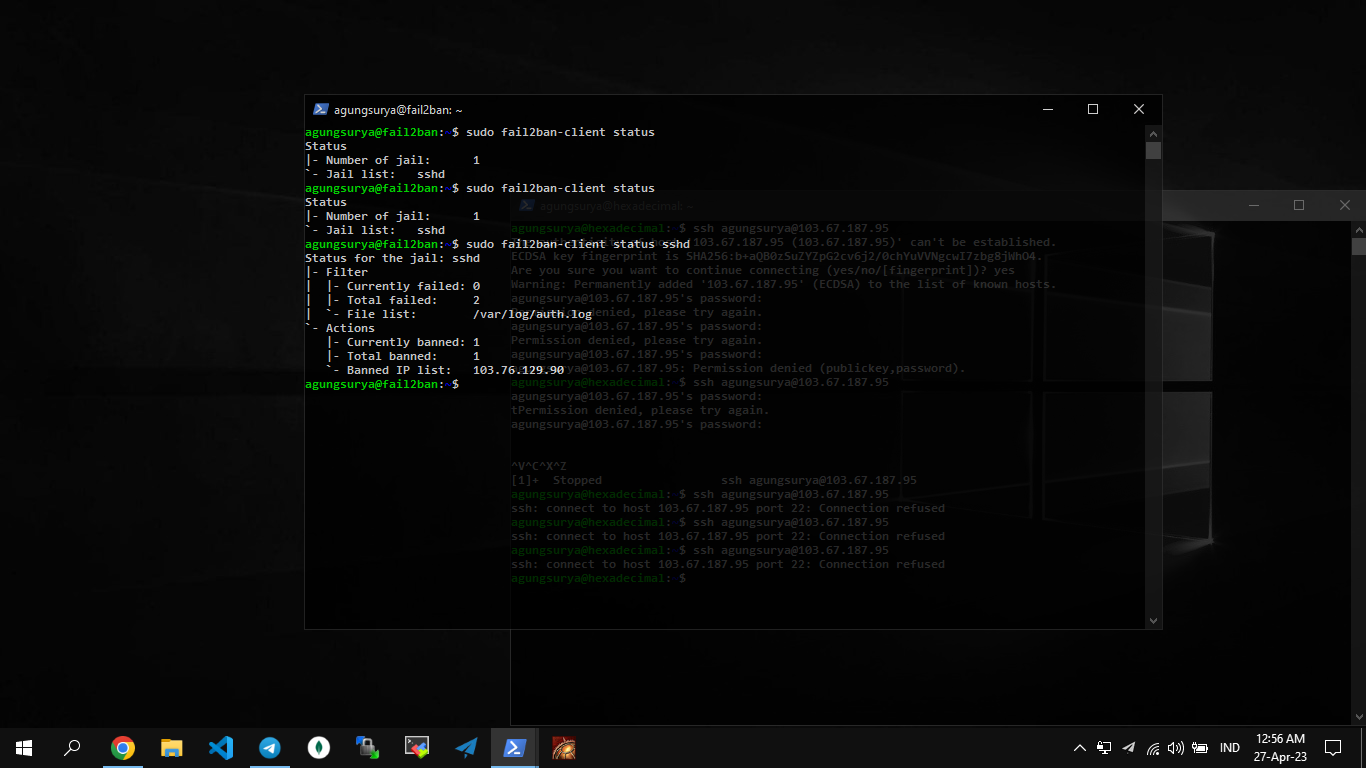 Dengan konfigurasi fail2ban ini, server SSH akan dilindungi dari serangan brute force, di mana alamat IP yang mencoba login dengan kombinasi username dan password yang salah sebanyak maxretry kali akan terkena ban selama bantime yang ditentukan. Selain itu, alamat IP yang ada pada daftar ignoreip tidak akan terkena ban oleh fail2ban.