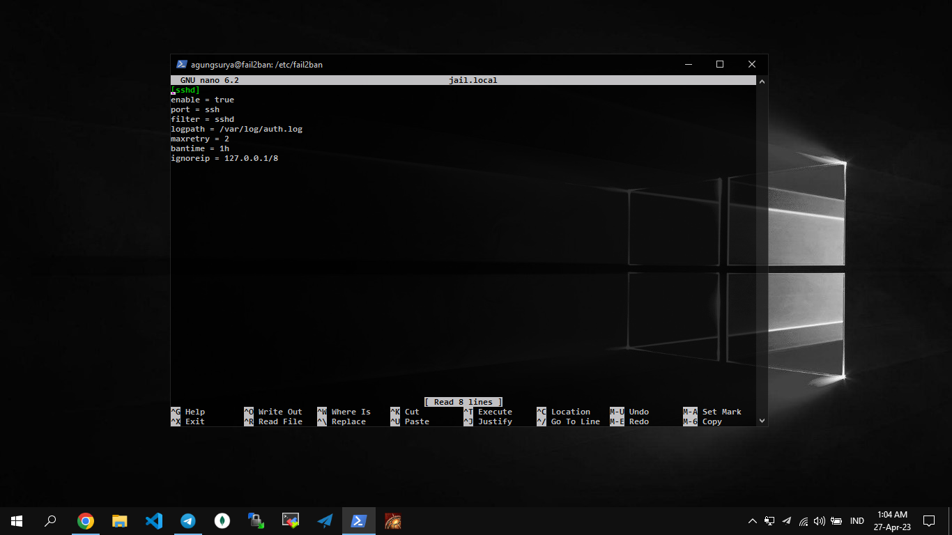 Membuat file jail.local, file ini akan dideteksi oleh Fail2ban sebagai konfigurasi jail yang di dalamnya akan kita atur sesuai kebutuhan, jika status enabled = true.