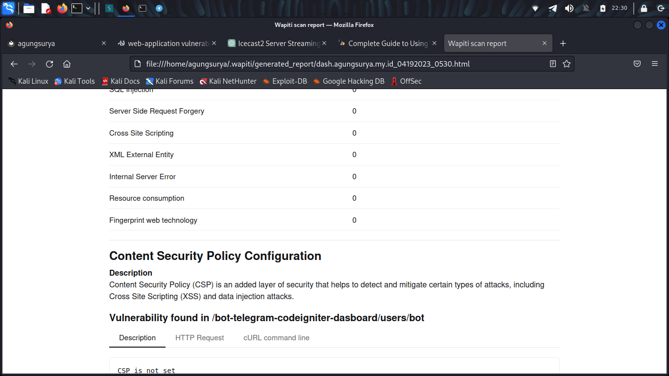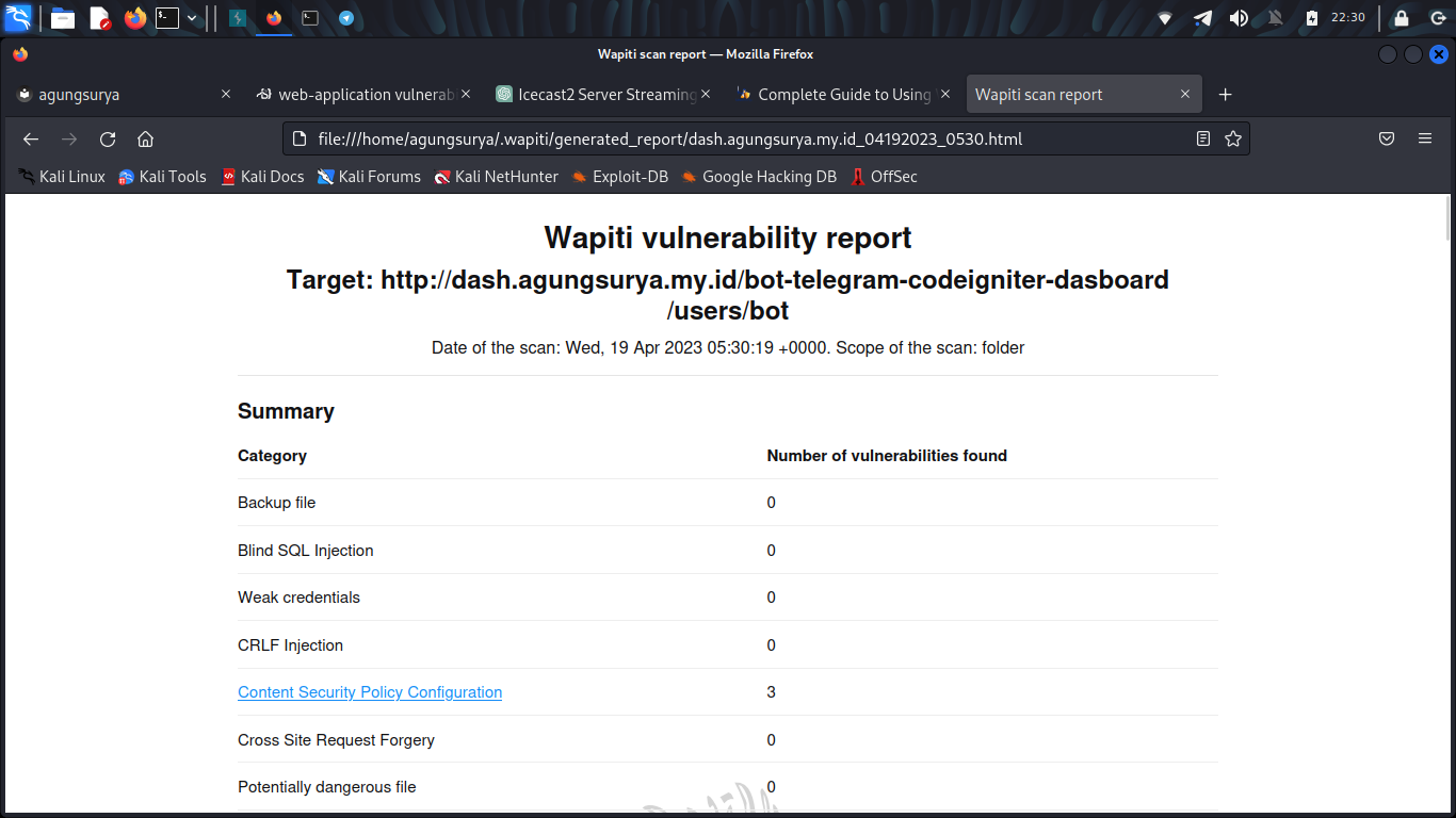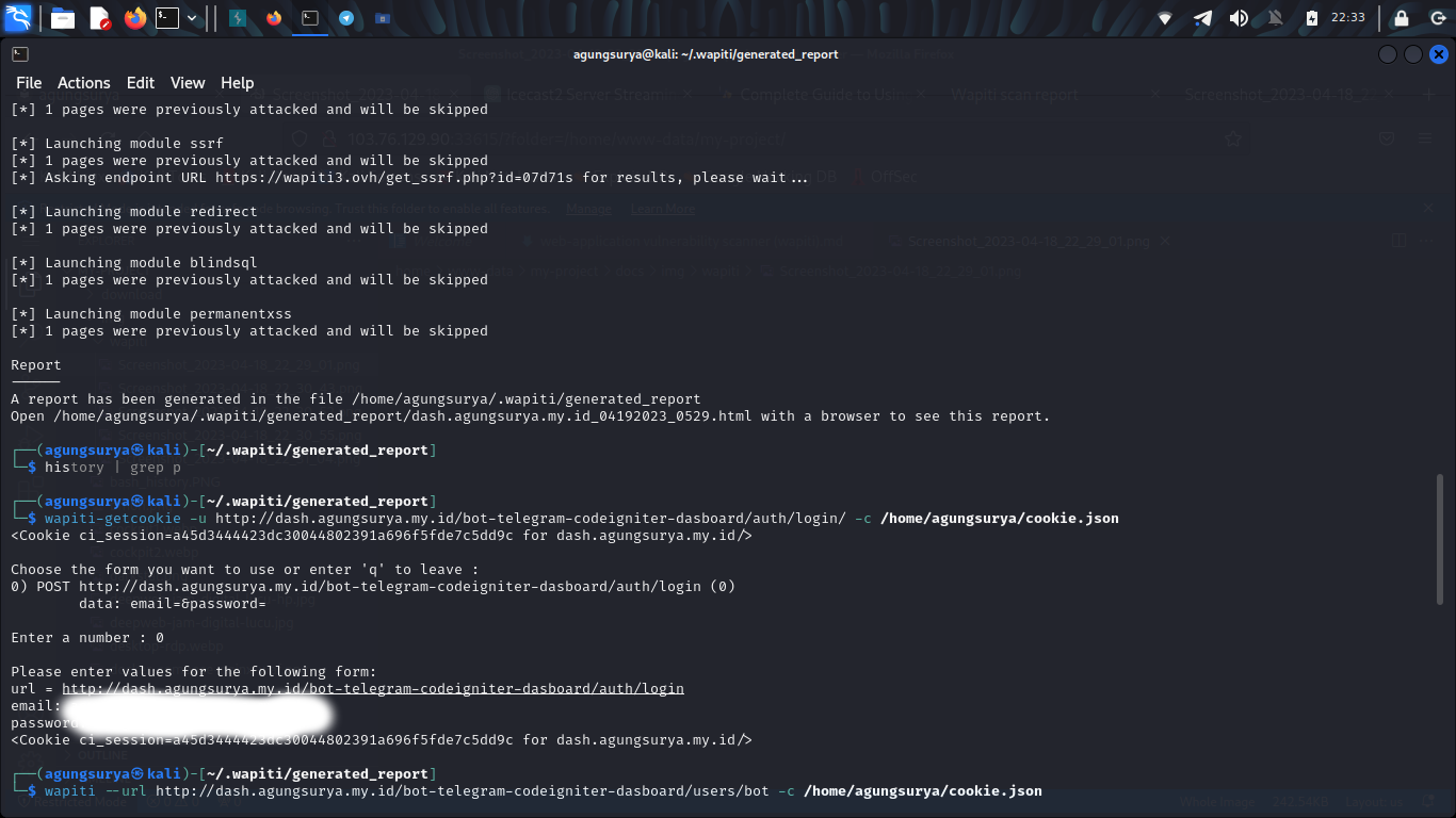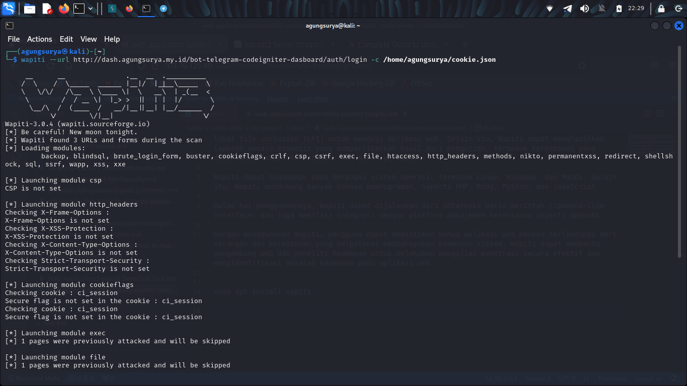 wapiti --url http://dash.agungsurya.my.id/bot-telegram-codeigniter-dasboard/users/bot -c /home/agungsurya/cookie.json