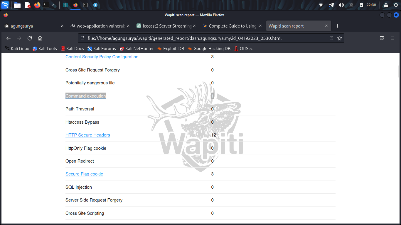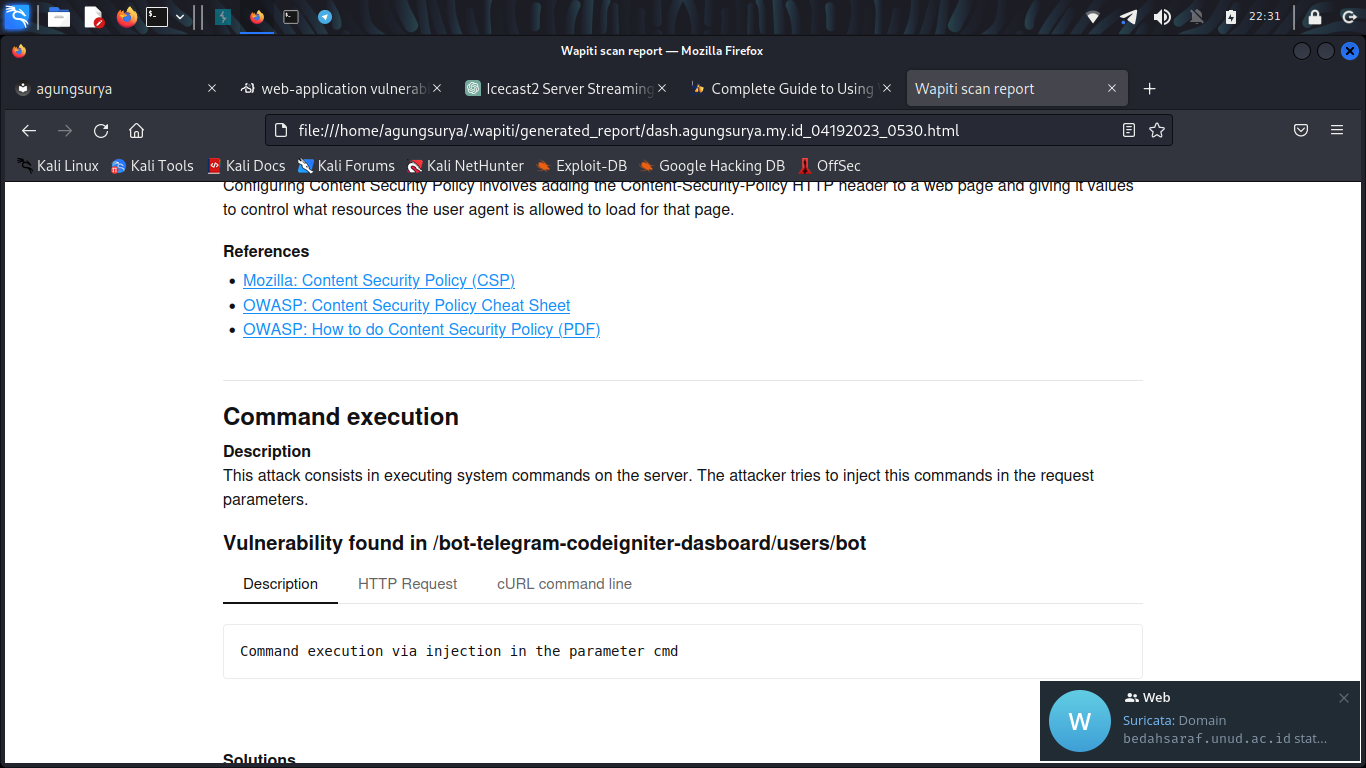 gambar ditas adalah report wapiti menemukan vulnerability command injection pada web yg di tes