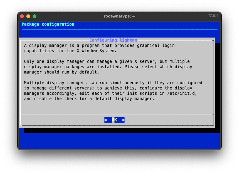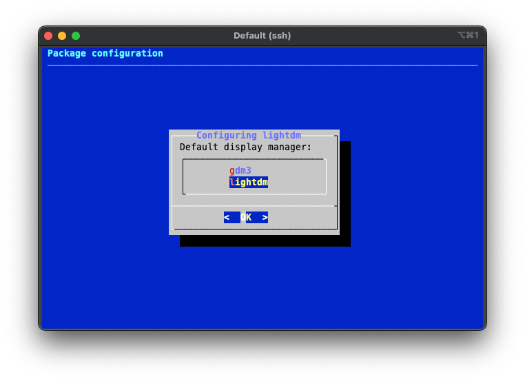dan tekan enter. Akan muncul perintah untuk menkonfigurasikan lightdm, pilih OK disini.