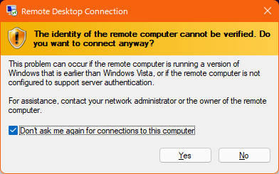 Jika muncul pop up seperti ini, Centang “Don’t ask me again for connections to this computer”, dan tekan Yes