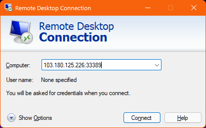 Jika sudah, buka program Remote Desktop Connection, dan isi Source IP dan Port sesuai yang kita isi tadi: